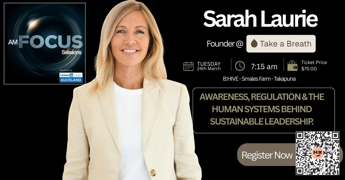 This session features Sarah Laurie - one of Aotearoa’s most compelling voices on people performance and the future of work. A best-selling author, media commentator, and corporate advisor, she is the founder of Take a Breath, a breakthrough healthtech platform that helps workplaces build capability.