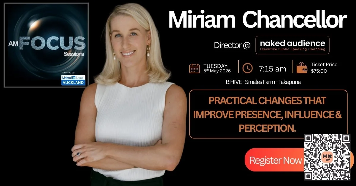 Our second session features Miriam Chancellor, a leading executive communication and presentation coach who works with professionals and senior leaders across New Zealand. Miriam specialises in helping people communicate with confidence and clarity, particularly in high-stakes environments where presence and delivery matter. Her work focuses on the small, practical changes that significantly improve how people present, influence and are perceived at work.